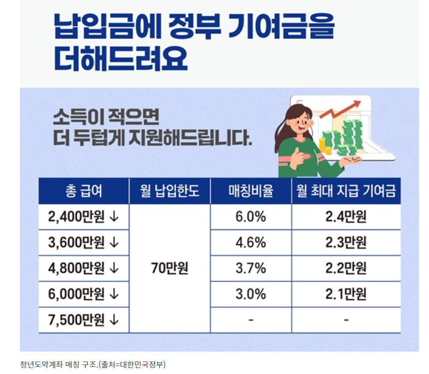 매월 40만∼70만원의 적금을 납입하면 정부가 월 최대 2만 4000원을 더해주는 방식